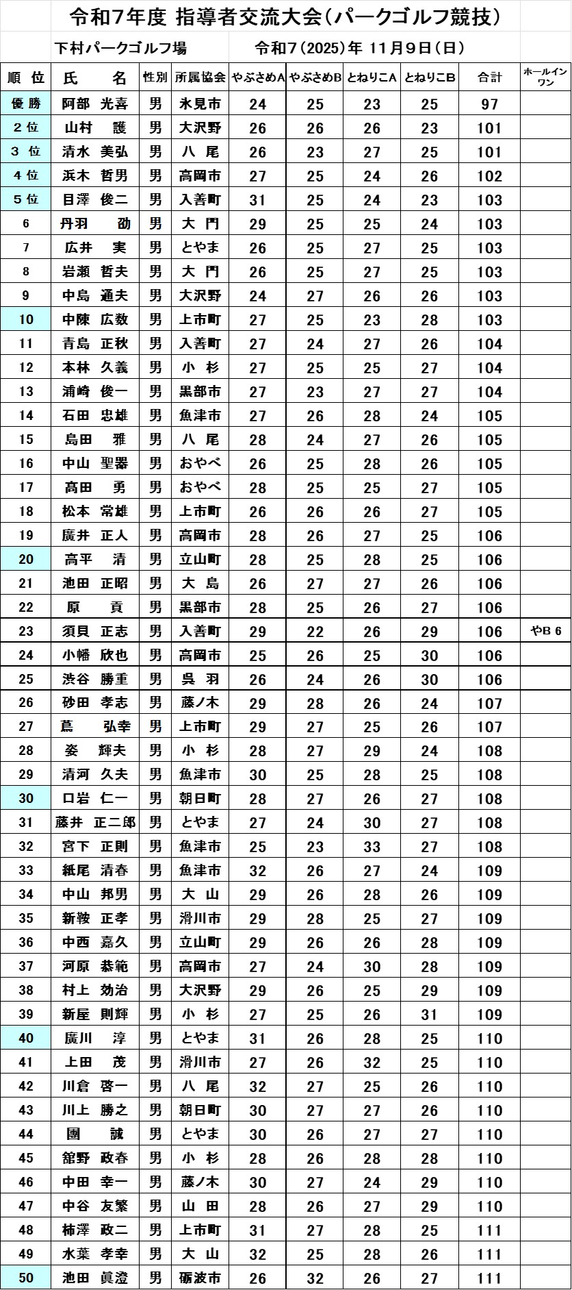 2025.富山市とやまパークゴルフ協会チャンピオン大会成績表(11/16富山PG場)