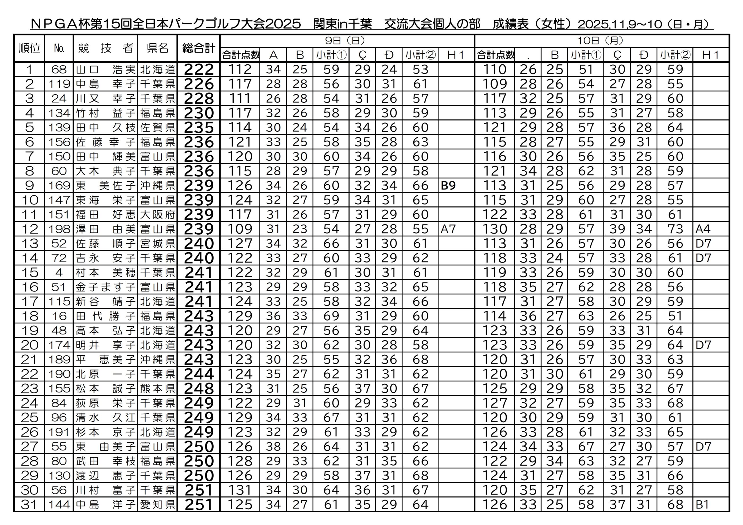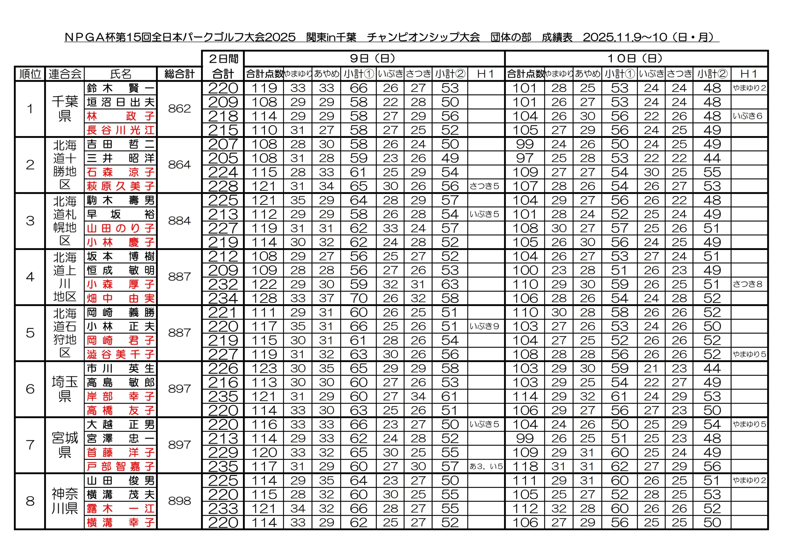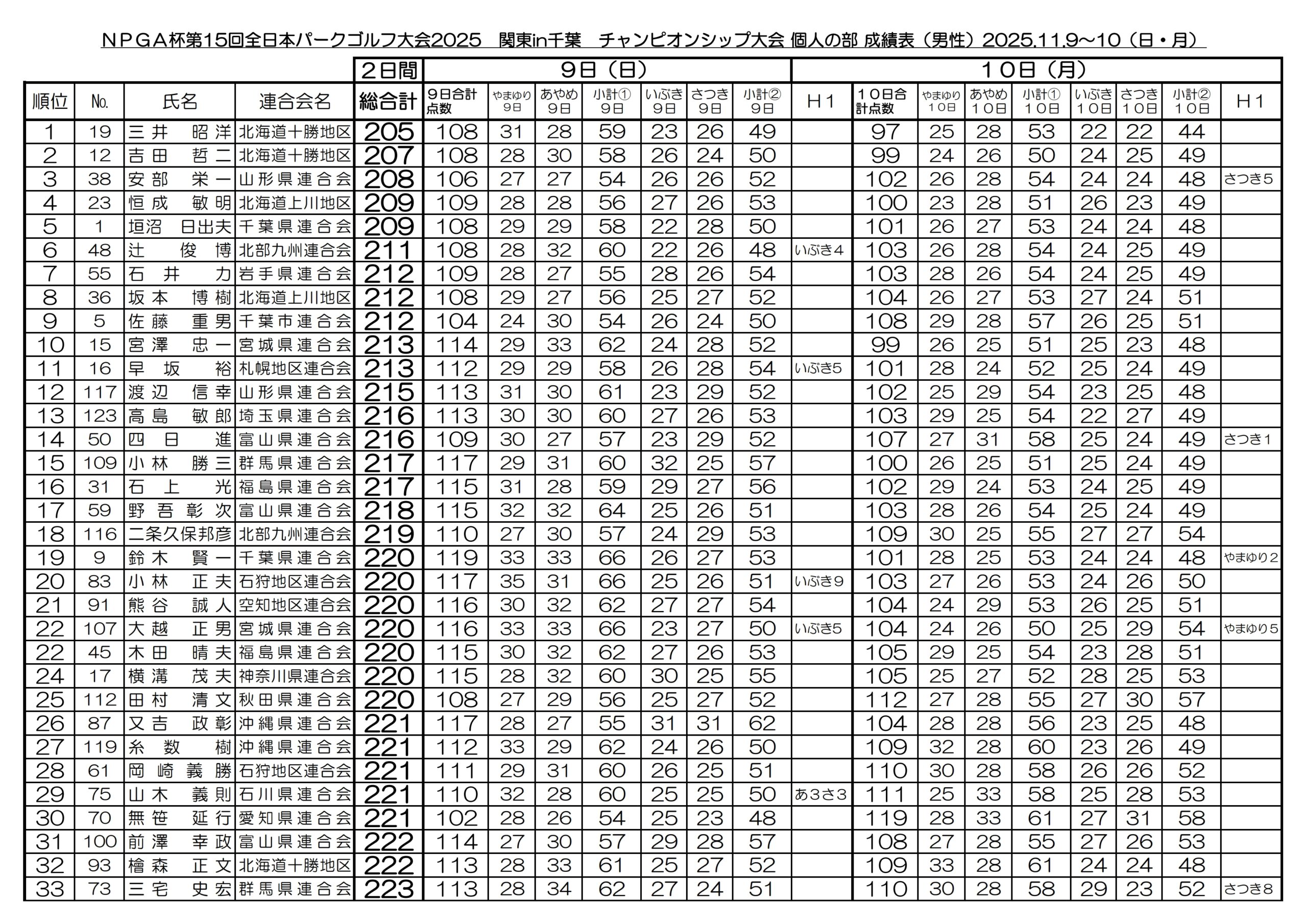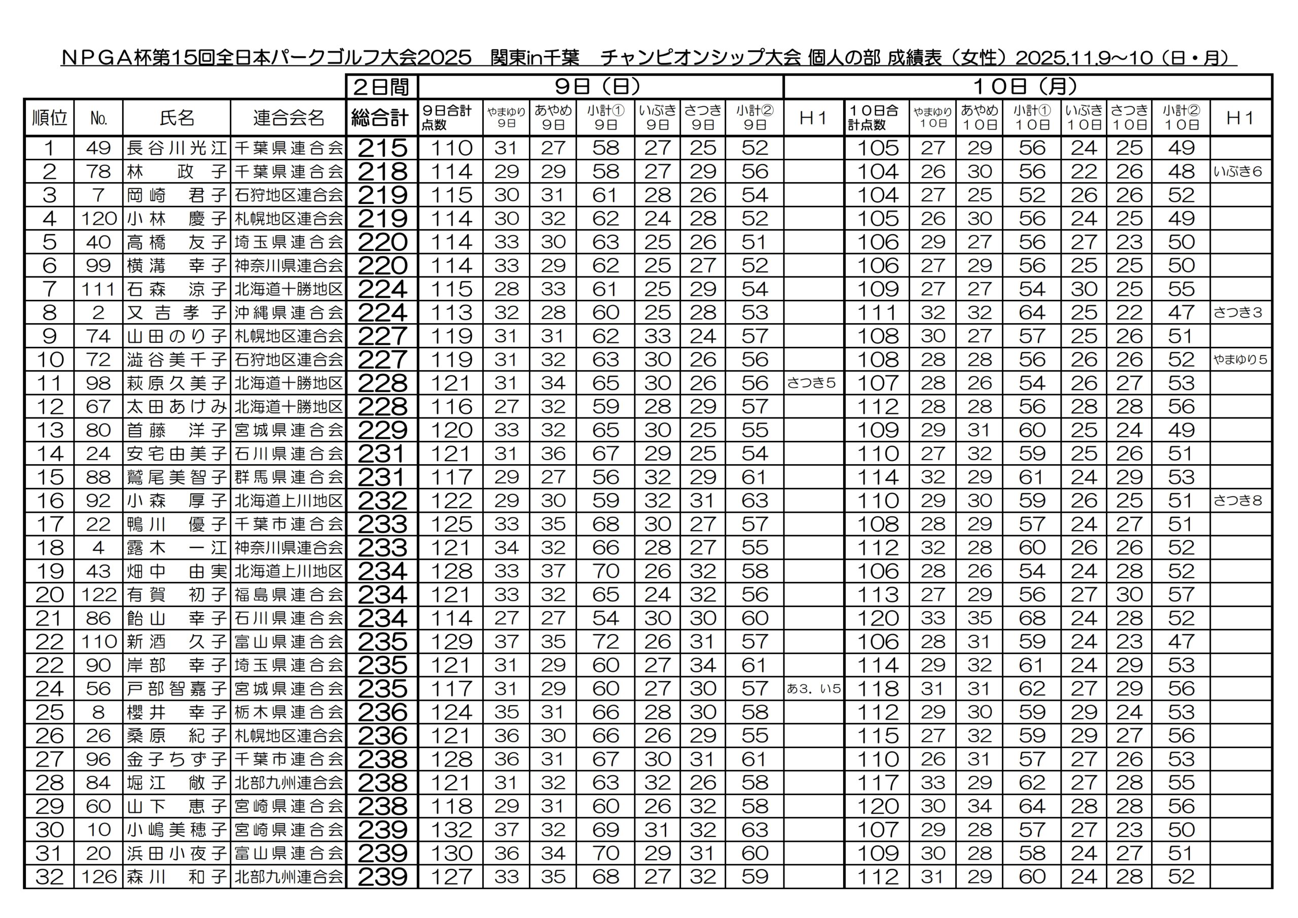 2025.第15回NPGA杯全日本PG大会 関東in千葉 個人の部成績表(11/9-11/10)