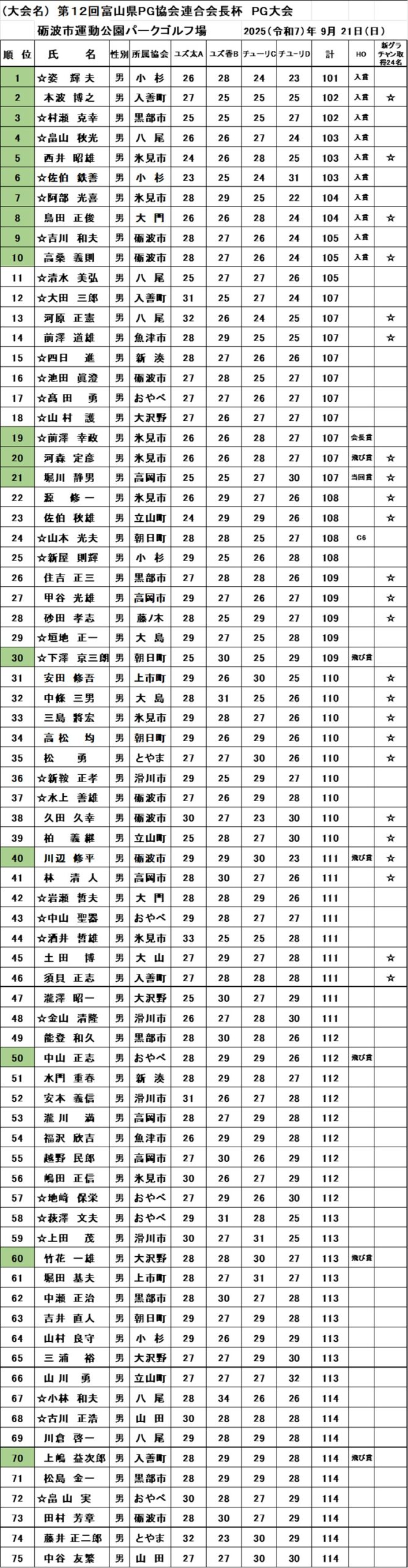 2025.第12回富山県PG協会連合会長杯成績表(9/21.砺波市運動公園パーク場)